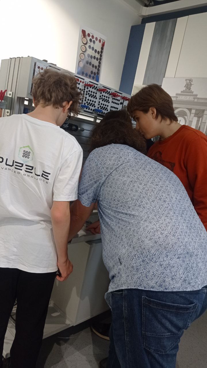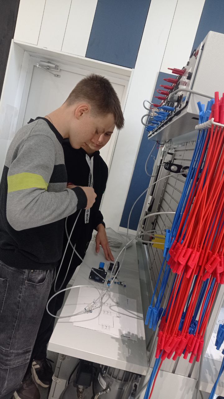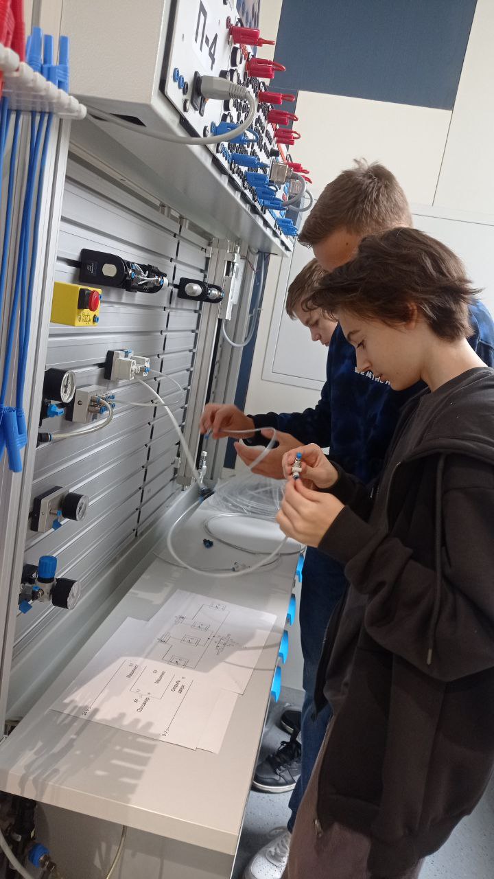 Стенды, на которых работали ребята, производственные, на таких же учатся взрослые люди на производстве. Провода и шланги потоньше, а так всё одинаковое, хотя поначалу выглядит внешне как конструктор.