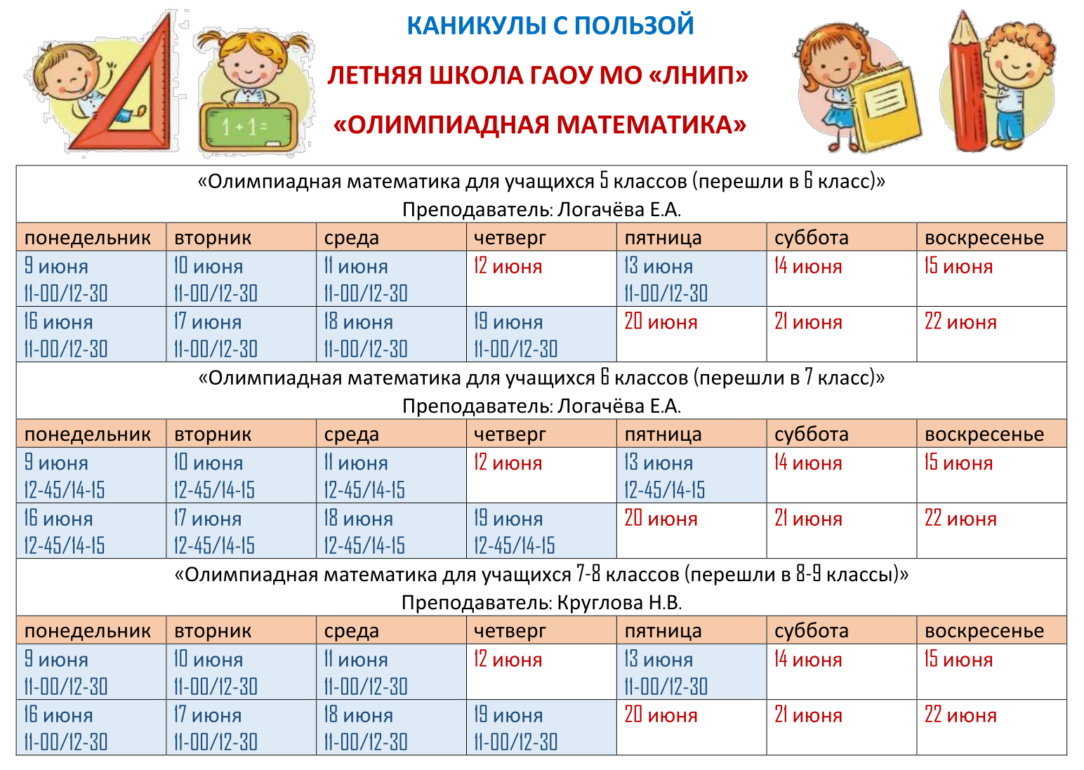 Обращаем внимание, что запись в группу «Олимпиадная математика 5 класс» (преподаватель Логачева Е.А.) предполагает тестирование, которое будет проходить 12 сентября (пятница) в 16.00 в здании лицея. Продолжительность работы 90 минут. С собой необходимо взять ручку и сменную обувь.